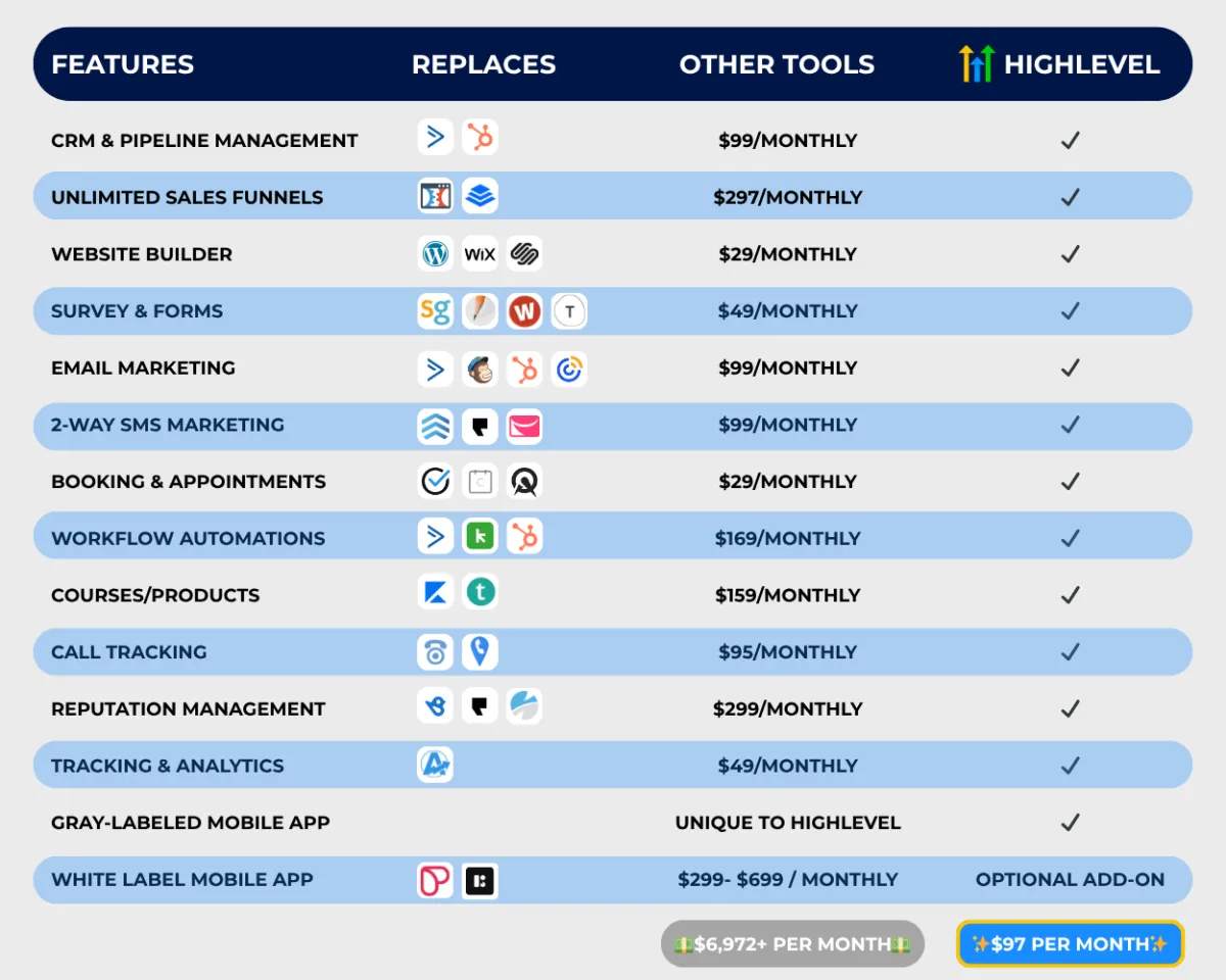 HighLevel is an all-in-one sales and marketing platform built for agencies and freelancers who want to offer automation, CRM, funnels, websites, review requests, email/SMS marketing, and more — all under one roof. It replaces tools like ClickFunnels, Calendly, Mailchimp, and Pipedrive… while letting you white label it as your own SaaS brand.